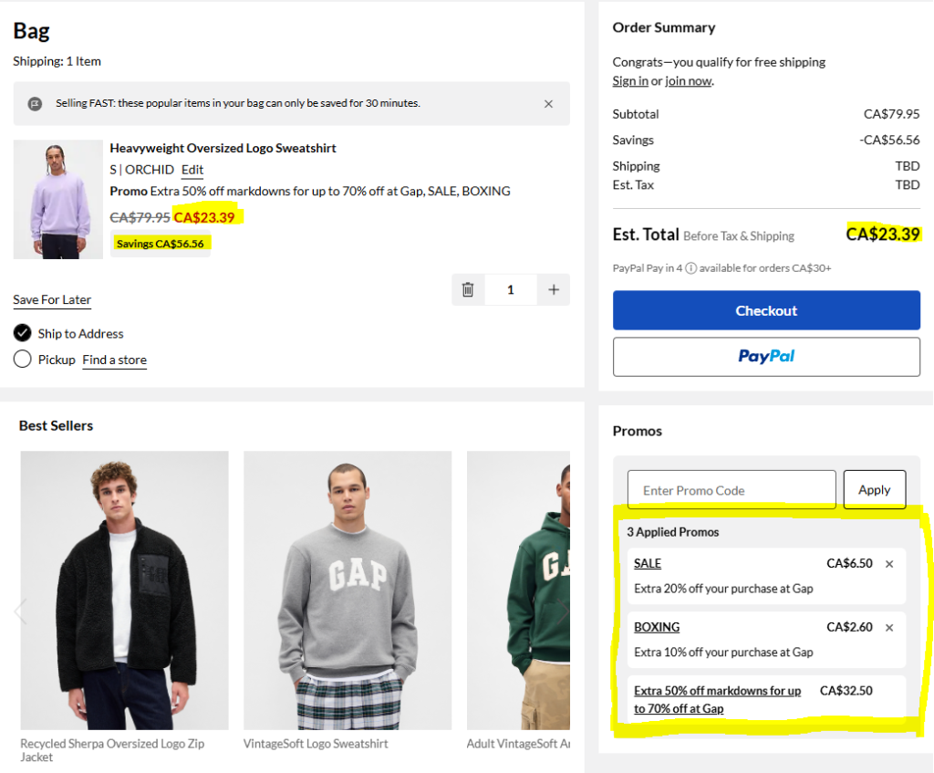 We were able to apply ALL 3 promos to the purchase of an Heavyweight Oversized Logo Sweatshirt. It’s originally priced at $79.95, with a markdown price of $64.99, but with the extra 50% off sale discount and 2 online promo codes, we were able to knock it down to $23.39 — a savings of $56.56!