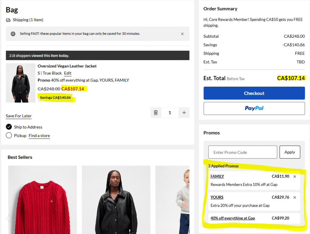 We were able to apply ALL 3 promos to the purchase of an Oversized Vegan Leather Jacket. It’s originally priced at $248.00, but with the 40% off Friends & Family discount and 2 online promo codes, we were able to knock it down to $107.14 — a savings of $140.86!