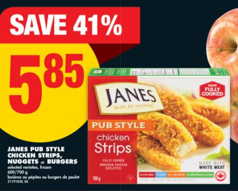 If you’re looking to make the most out of this coupon, check your local No Frills flyer, because you can get Janes Pub Style Chicken Strips, Nuggets or Burgers for $5.85 — combine it with this coupon to get a box for only $1.85!